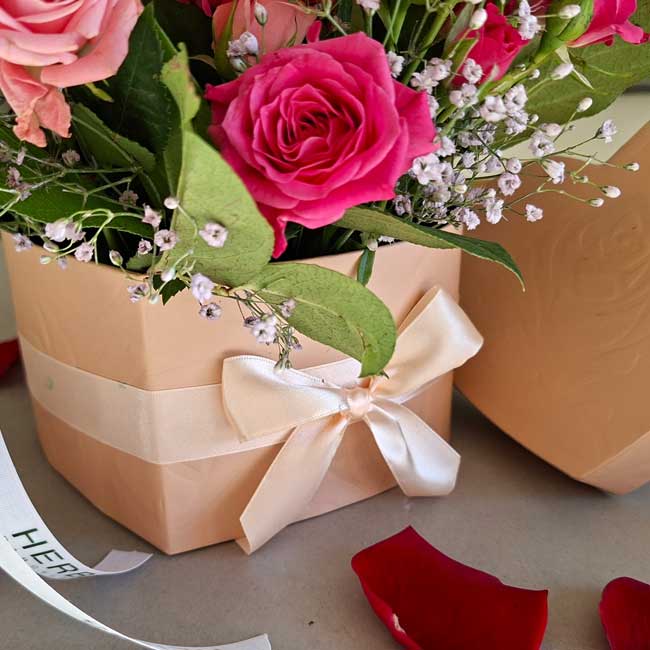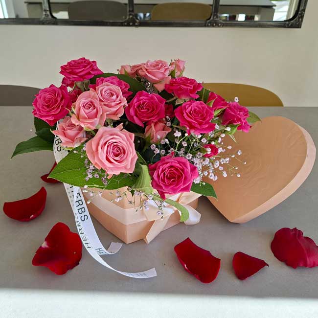 La caja de color rosa con forma de corazón es el complemento perfecto para las rosas y hace que el regalo sea aún más especial.