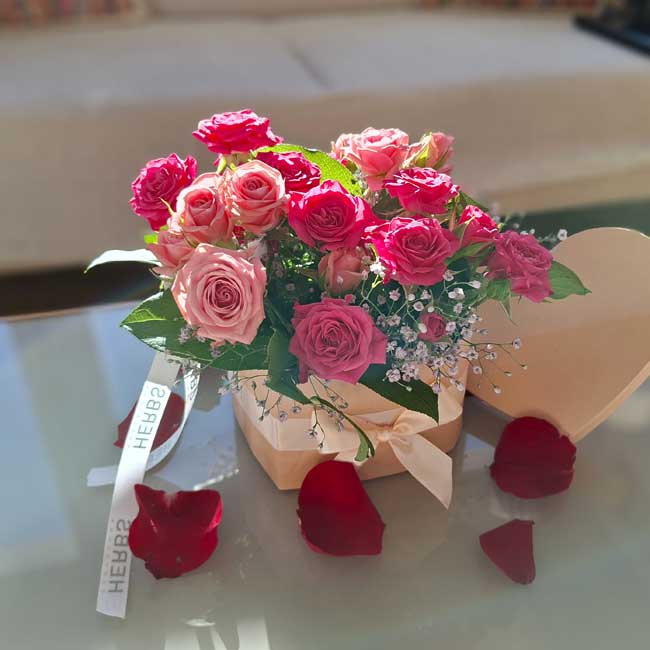 Hecha con rosas frescas y ramificadas, esta caja única y romántica es perfecta para cumpleaños, aniversarios, o simplemente para demostrar el amor y la gratitud.