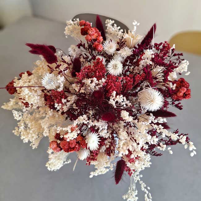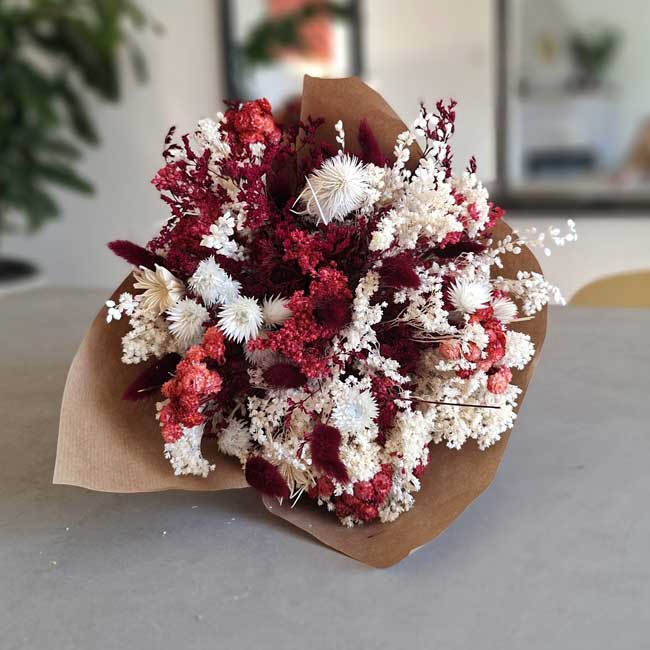 La composición incluye una cuidada selección de flores secas y preservadas como siemprevivas, paniculata, lagurus en tonos burdeos y delicados detalles en blanco que aportan equilibrio y luminosidad. El resultado es un ramo con presencia, textura y un aire contemporáneo que no pasa desapercibido.