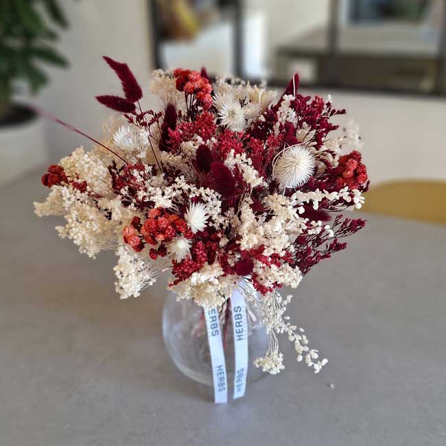 Este sofisticado ramo de flores secas en tonos rojos profundos y blancos es una combinación perfecta de carácter, elegancia y calidez. Diseñado artesanalmente por Herbs Barcelona, destaca por su contraste cromático y su estilo natural, ideal para quienes buscan una decoración con personalidad.