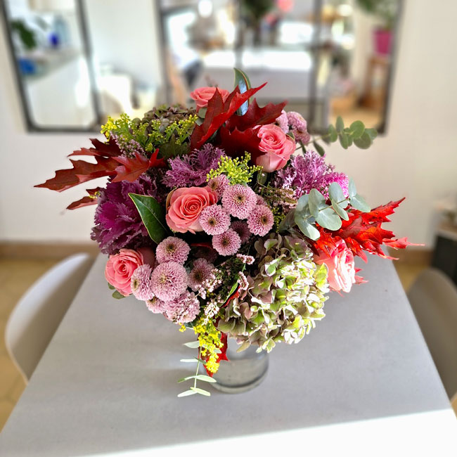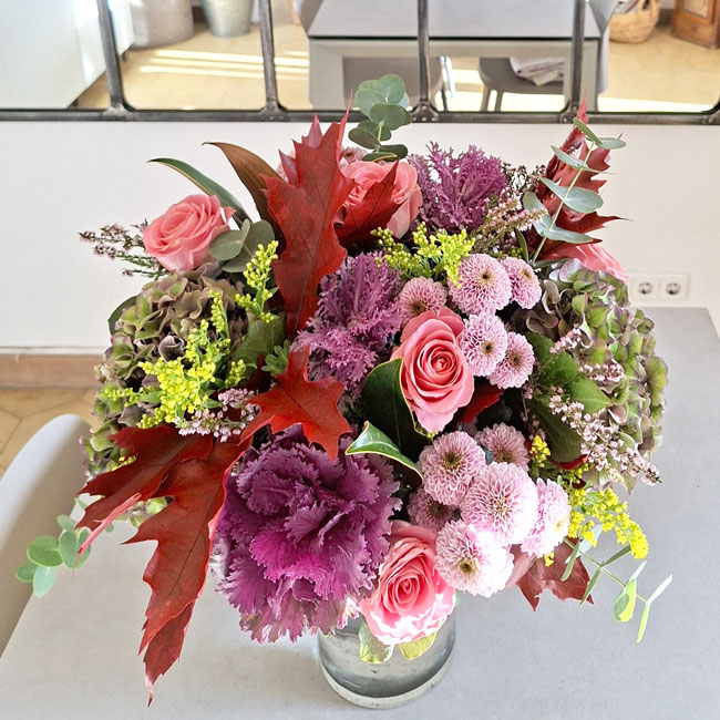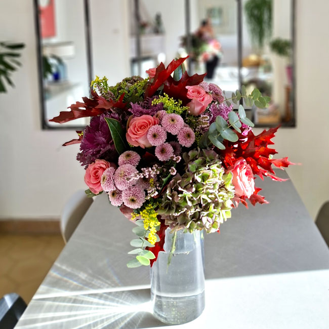 Opta por la tendencia del momento. Ramo de flores de hortensia, rosas y flores de otoño de temporada para esta composición despreocupada y bohemia.